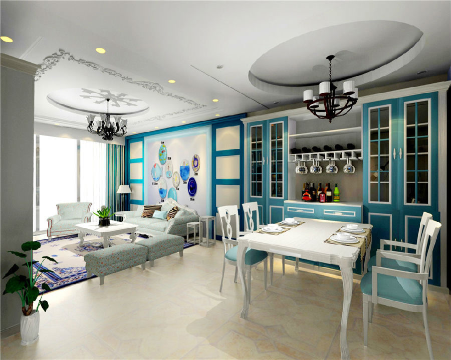 首先被吸引的就是色彩的搭配,顏色大膽卻不會覺得過于浮夸,在圓形吊頂?shù)囊r托下,一切渾然天成,精致的餐桌與餐椅交相輝映,極簡中透露出一股子小清新。